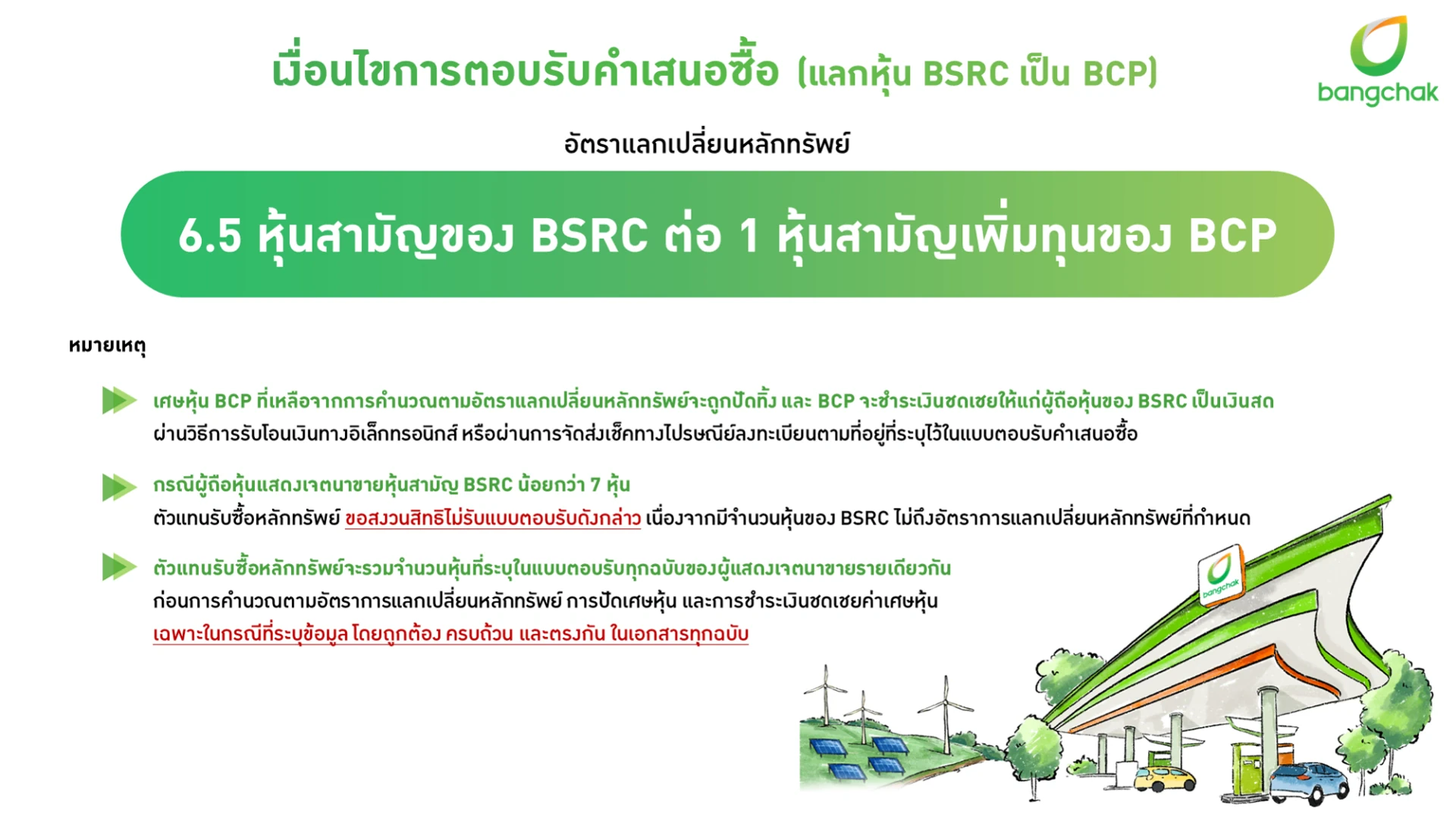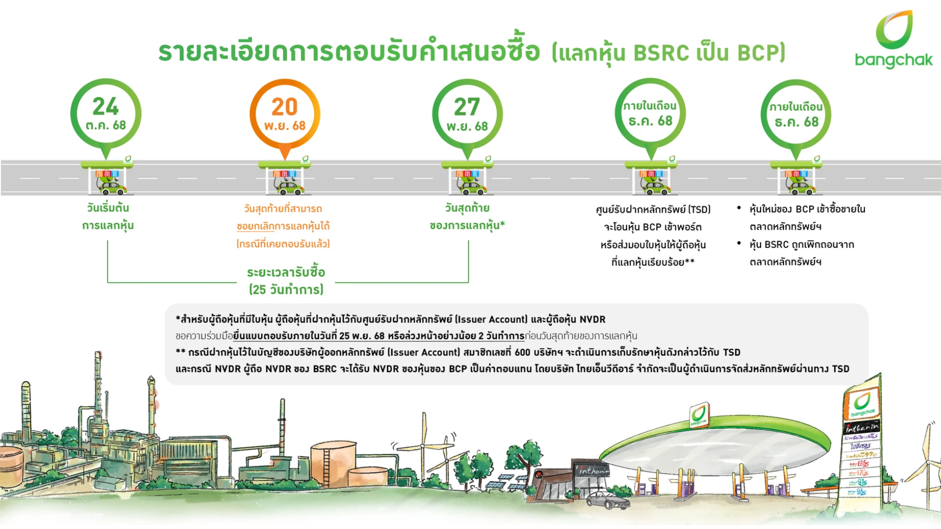 BCP อยู่ระหว่างการปรับโครงสร้างการถือหุ้นและการจัดการ โดยการซื้อหุ้นสามัญทั้งหมดของบริษัท บางจาก ศรีราชา จำกัด (มหาชน) หรือ BSRC ผ่านการทำคำเสนอซื้อหลักทรัพย์ ซึ่งผู้ถือหุ้น BSRC จะได้รับชำระราคาเสนอซื้อด้วยหุ้นสามัญเพิ่มทุน BCP ที่ออกใหม่ ในอัตรา 6.5 หุ้นสามัญของ BSRC ต่อ 1 หุ้นสามัญเพิ่มทุนของ BCP โดยมีระยะเวลาการแลกหุ้นตั้งแต่ 24 ตุลาคม – 27 พฤศจิกายน 2568 (เฉพาะวันและเวลาทำการ)