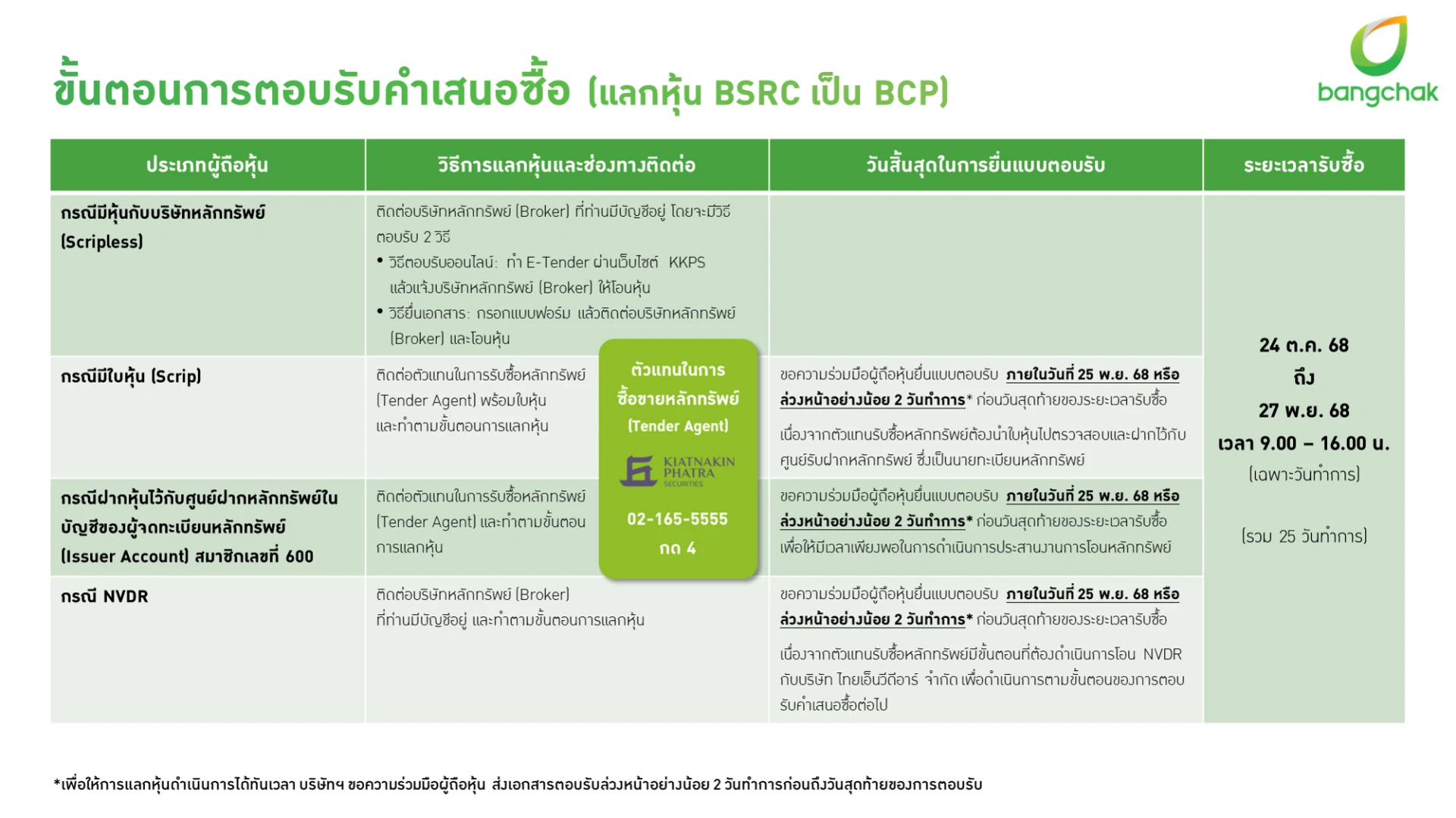 ขอความร่วมมือให้ผู้ถือหุ้นยื่นแบบตอบรับคำเสนอซื้อฯ ภายในวันที่ 25 พฤศจิกายน 68 หรือล่วงหน้าอย่างน้อย 2 วันทำการก่อนวันสุดท้ายของระยะเวลารับซื้อ เนื่องจากตัวแทนในการรับซื้อหลักทรัพย์ต้องนำใบหุ้นไปตรวจสอบและฝากไว้กับศูนย์รับฝากหลักทรัพย์ ซึ่งเป็นนายทะเบียนหลักทรัพย์